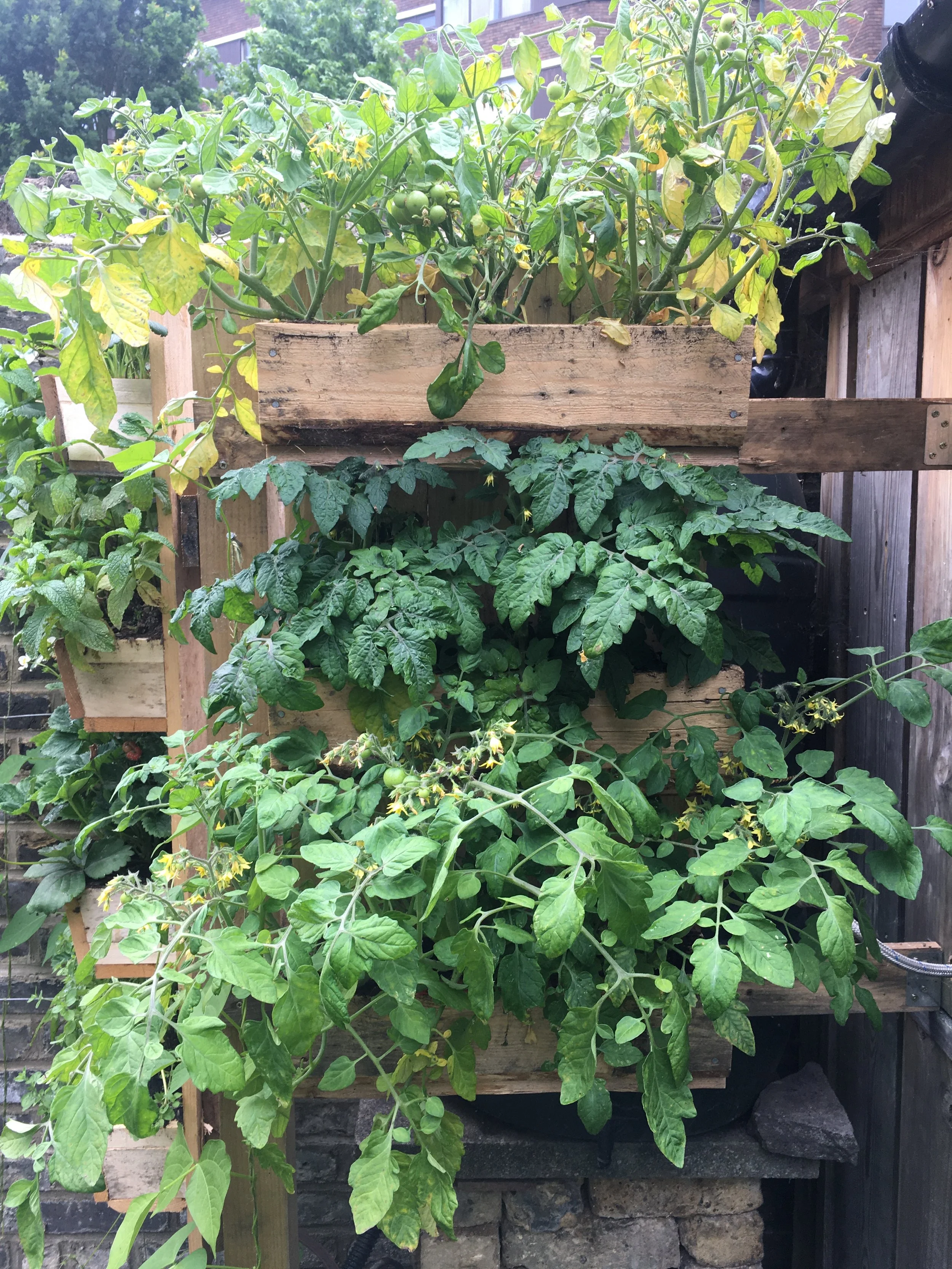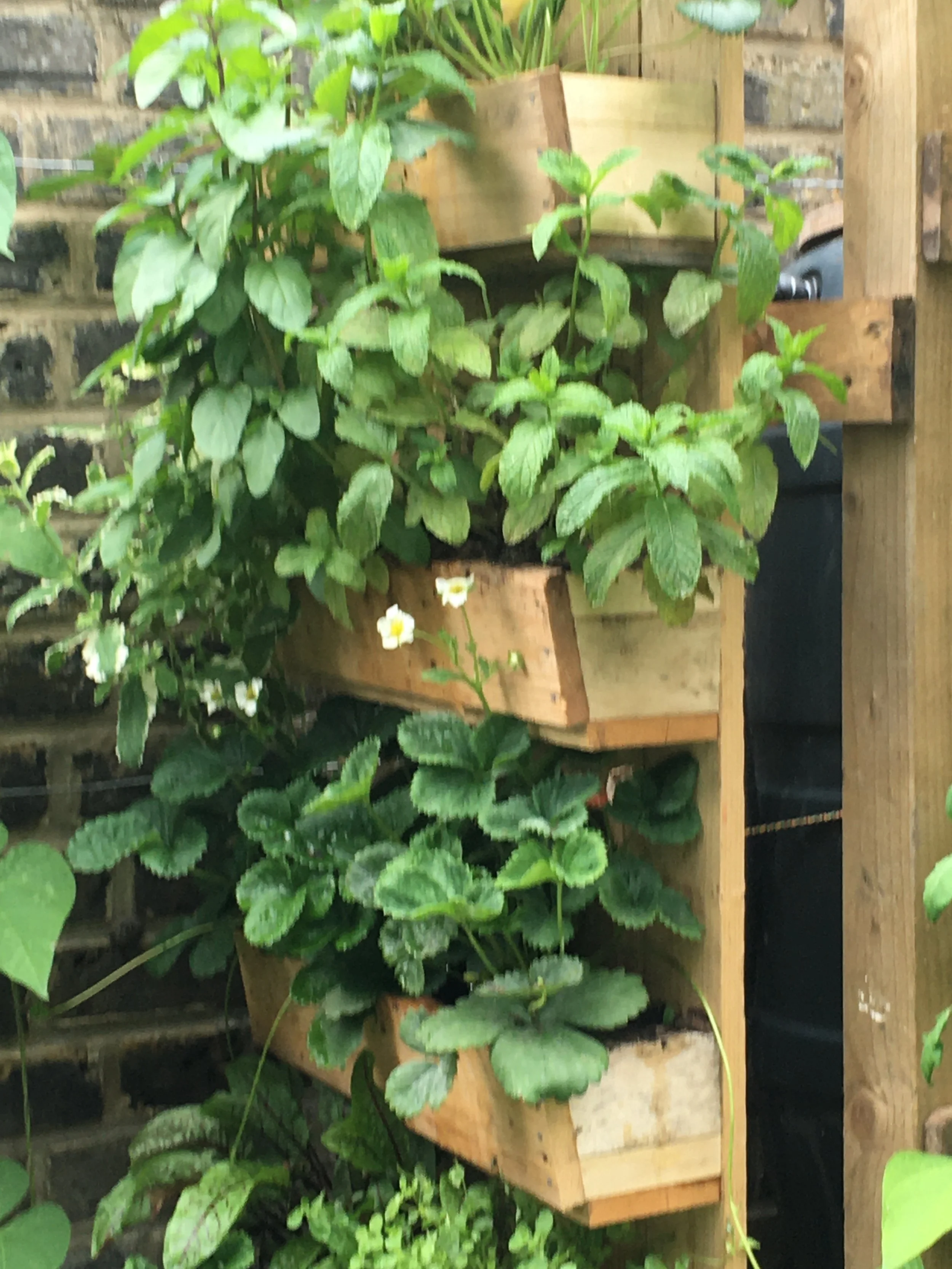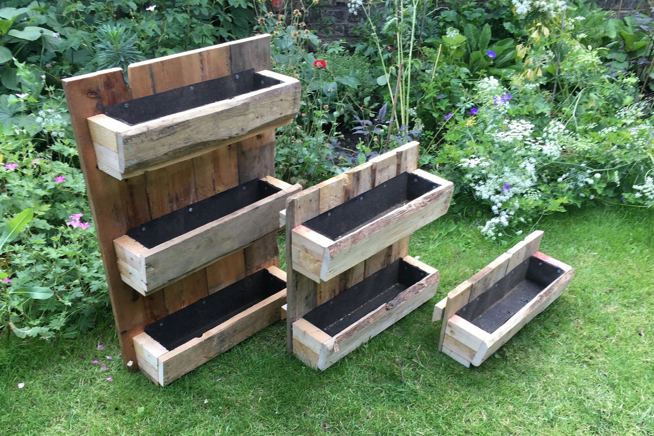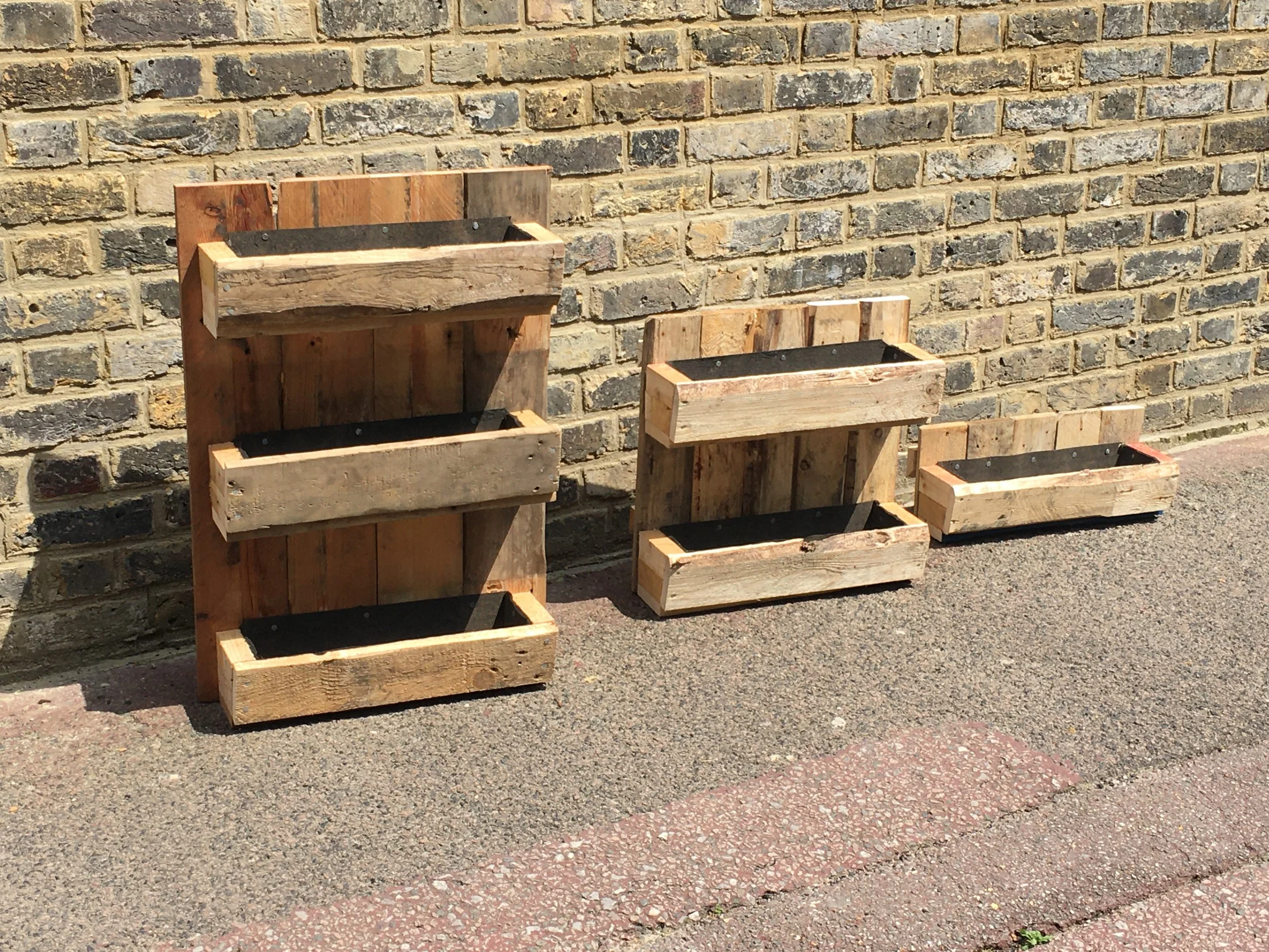 A range of simple wall mounted boxes made good use of pallet wood. Could be used on balconies, small gardens and patios.