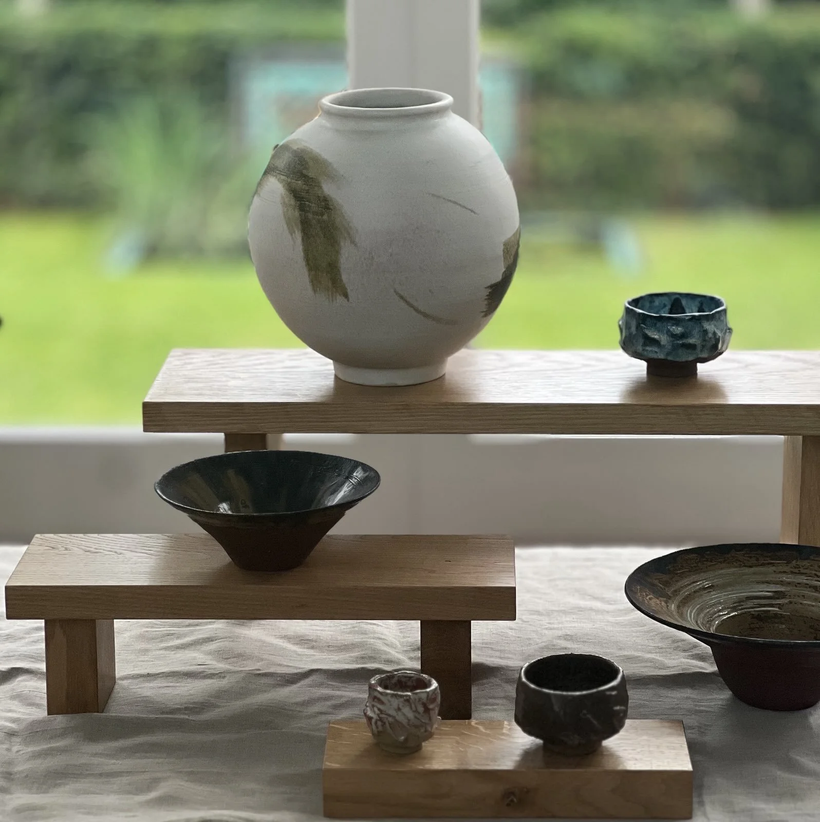 Kathy’s work is inspired by Japanese ceramics. The shelves have been designed to enhance her work using simple chunky 50mm thick slabs of solid oak.