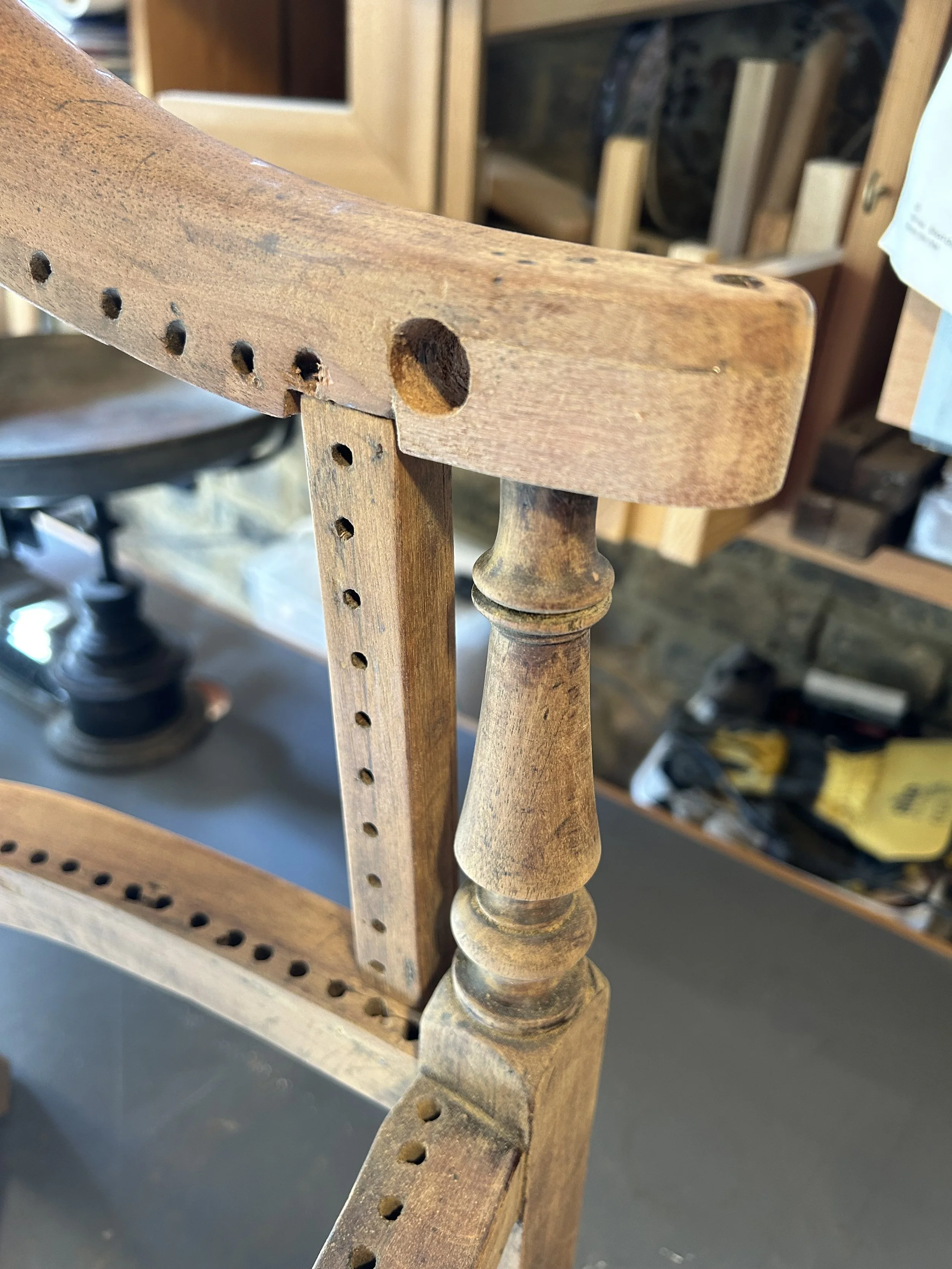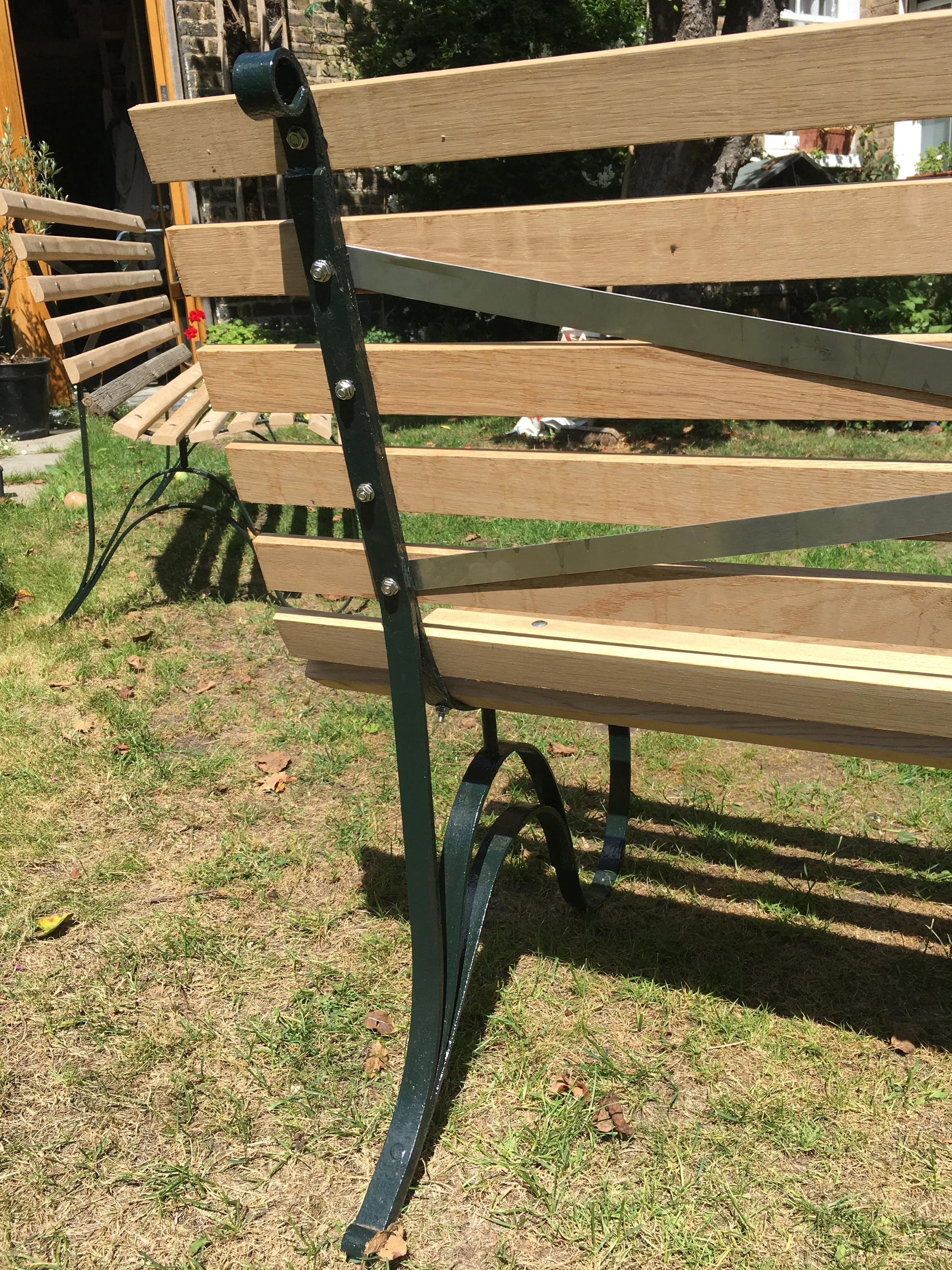 Two garden benches needed new oak seat and back. A Willaim IV high chair stripped back and re-built ready for new seat and back. A Small table lamp needed new beech strutts.