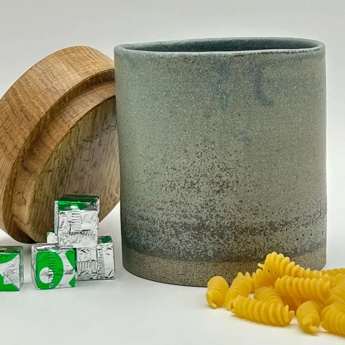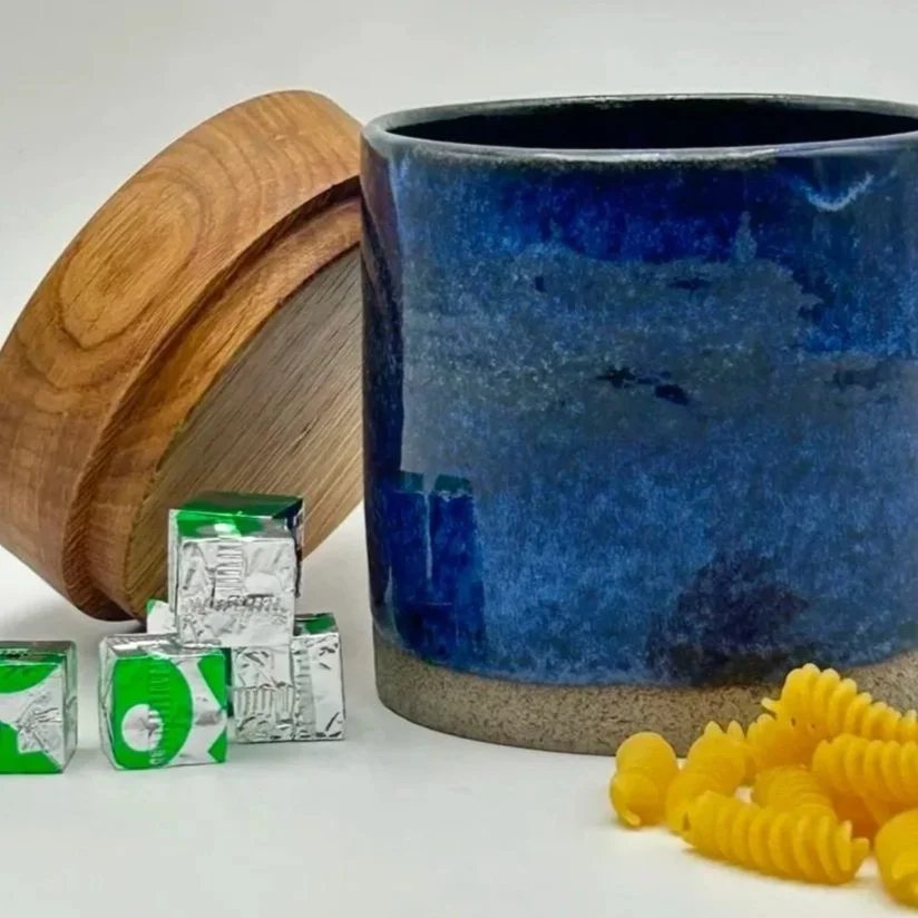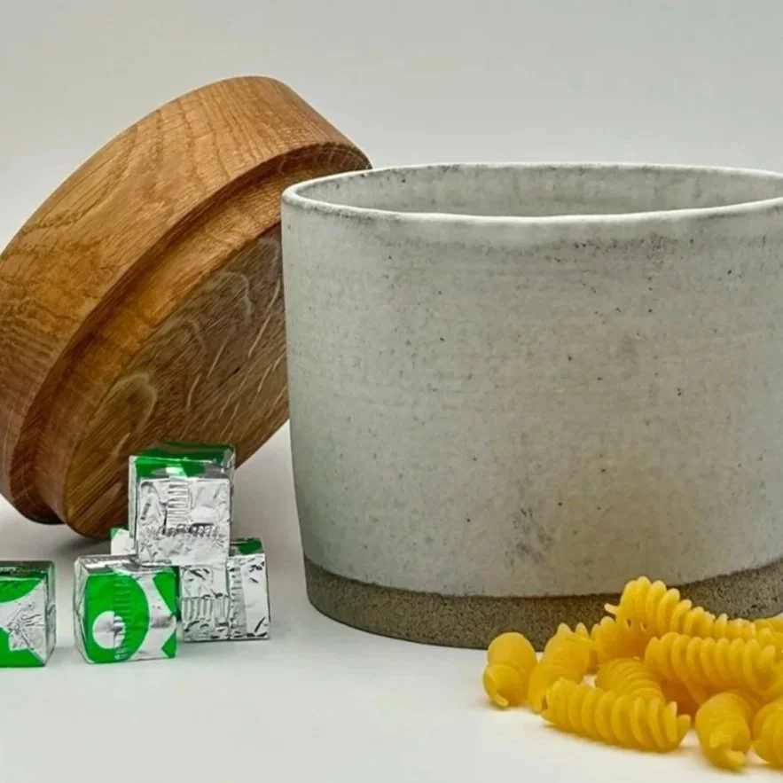 Wood and clay are two very different materials that compliment each other. Solid oak tops have a gentle warm feel that contrasts sharply with the cold hard surface of the ceramic jars.